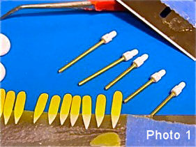 Note that it is nearly impossible to cut the blade tips to the correct (curved) shapes. This is where sandpaper and tedium set in. I usually stack four to five of the rough-cut blades on top of one another, hold them tightly together, and then gently sand the tips to the correct shape.