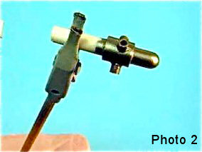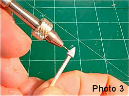 For example, say the distance is 12 millimeters. Depending on the number of prop blades (three, four or more), divide the distance (12 mm) by the number of blades. In our example, a 3 bladed prop would yield 12 mm divided by 3, or 4 mm. Now place small black dots at 4mm intervals on the 12 mm section of tape. The tape now has four dots on it, one at the end, the next at 4mm, the next at 8mm and the last one at 12 mm. Next, rewrap the tape around the hub/spinner one time, just as before. The first and last points overlap at the same point (point one). You now have three equally spaced points on the hub/spinner (point one, point two at 4 mm, and point three at 8 mm). Using a small needle probe, make a small “starter” hole in the hub/spinner at each of the three points. Remove the tape, and then use a small drill bit to enlarge the holes into which the prop blades will be inserted (see photo 3).